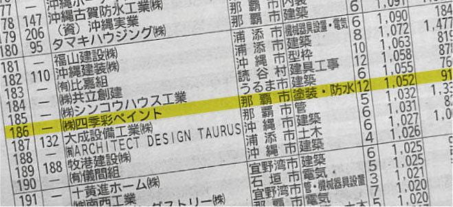 沖縄県内の施工業者約10,000社のうち、「売上高10億円以上」の成績優秀な全204社の中で 186位という成績!