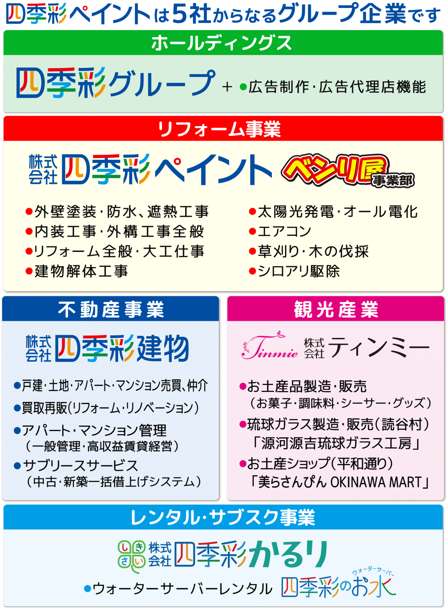 グループ企業 | 株式会社四季彩建物(不動産業) 株式会社ティンミー(お土産品製造・卸・販売) 源河源吉琉球ガラス工房(読谷村) 美らさんぴんOKINAWAMART(お土産品店:平和通り1店舗、国際通り3店舗) |