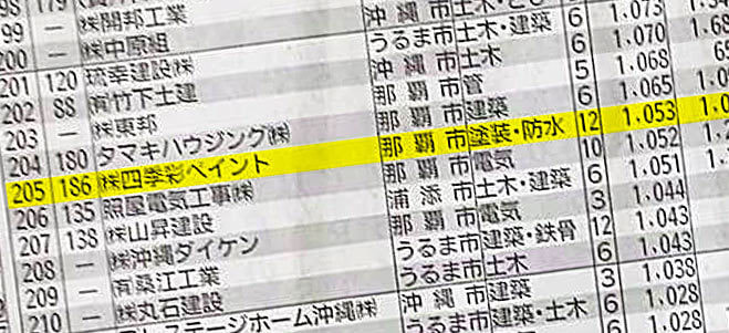 沖縄県内の施工業者約10,000社のうち、「売上高10億円以上」の成績優秀な全224社の中で 205位という成績!